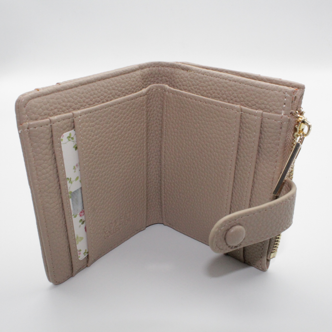 Dotato di scomparti interni per carte, banconote e tasca con zip per monete.