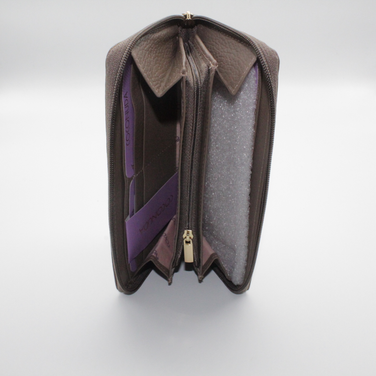 Chiusura con zip perimetrale e interno organizzato con scomparti per carte, banconote e tasca portamonete.